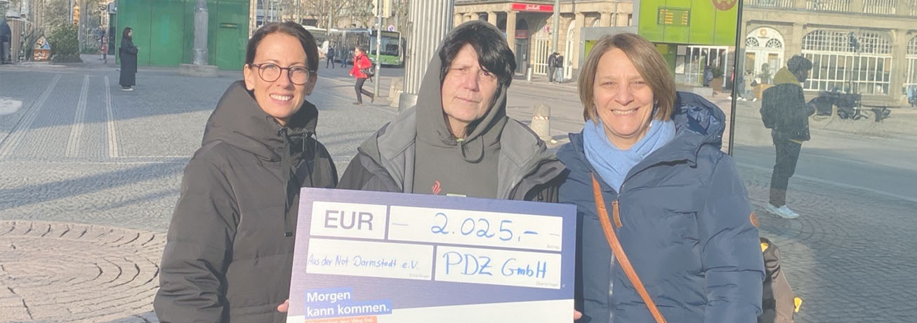 Nach unserer Weihnachtsspende von 2.025 Euro an »Aus der Not – Darmstadt e.V.« haben wir vor Kurzem den symbolischen Scheck persönlich übergeben und bewegende wie beeindruckende Momente erlebt. Deshalb möchten wir unsere Erfahrung an dieser Stelle mit Ihnen teilen und ein bisschen mehr von der Arbeit des Vereins erzählen. Im Mittelpunkt steht dabei Petra Bier – die zentrale Vertrauensperson für viele obdachlose Menschen in Darmstadt. Sie begegnet ihnen auf Augenhöhe, ist oft der einzige verlässliche Kontakt nach außen: Sie spricht mit Polizei und Behörden, unterstützt bei Arztterminen, Behördengängen und stellt Verbindungen zu Familien wieder her. Wie Frau Bier selbst, engagiert sich der gesamte Verein mit gleichem Herzblut auch für ältere Menschen und Kinder in Armut – immer unbürokratisch und menschlich.